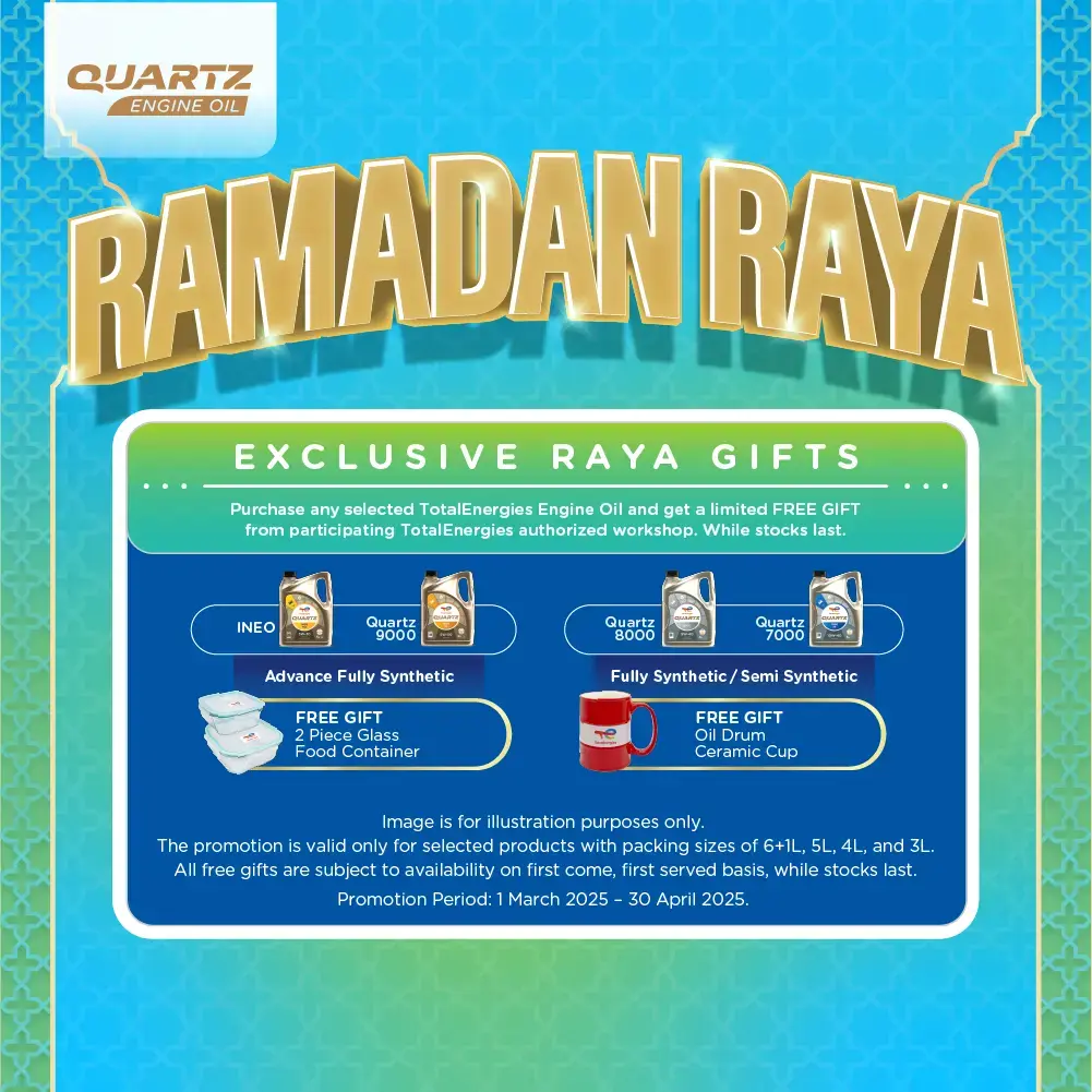 From 1 March to 30 April 2025, enjoy exclusive Raya gifts when you purchase TotalEnergies Quartz Lubricants at our participating authorized workshops, Shopee, or Lazada Official Stores!